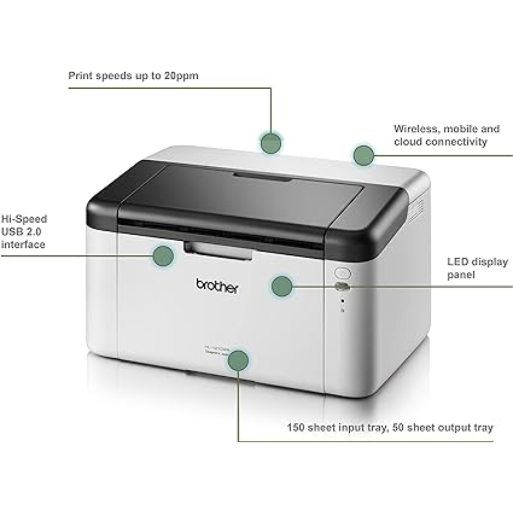 La Brother HL-1210W es una impresora láser monocromo con impresión a una cara y formato máximo A4. Utiliza conexión Wi‑Fi IEEE 802.11b/g/n y puerto USB 2.0 Hi-Speed. La velocidad de impresión es de hasta 20 páginas por minuto y la resolución es de hasta 2400 x 600 ppp. Incorpora 32 MB de memoria y un ciclo de trabajo mensual de hasta 9.000 páginas. La bandeja de entrada admite 150 hojas y la bandeja de salida 50 hojas. Es compatible con papel normal, reciclado y sobres en tamaños A4, Letter, Legal, Folio, A5, B5, Executive, DL, C5, Com-10 y Monarch. El gramaje admitido para papel estándar es de 65 a 105 g/m². Utiliza consumibles Brother TN-1050 para tóner y DR-1050 para tambor. El tiempo de impresión de la primera página es inferior a 10 segundos desde modo lista.