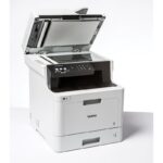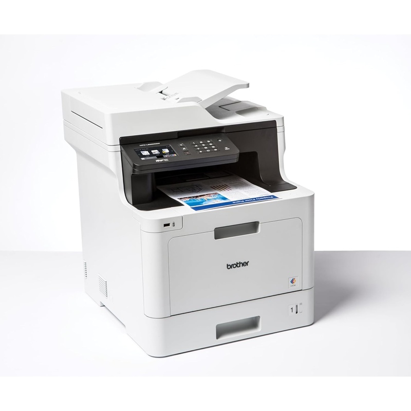 Brother MFC-L8690CDW es una impresora multifunción láser con funciones de impresión, copia, escaneo y fax. Velocidad de impresión y copia de hasta 31 páginas por minuto. Impresión automática a doble cara. Alimentador automático de documentos de 50 hojas, bandeja de entrada de 250 hojas y bandeja multipropósito de 50 hojas; capacidad ampliable con bandejas opcionales hasta 1.050 hojas. Pantalla táctil de 9,3 cm y memoria de 512 MB. Conectividad mediante USB 2.0, Gigabit Ethernet, Wi‑Fi IEEE 802.11b/g/n, Wi‑Fi Direct y NFC. Compatibilidad con AirPrint, Mopria y Brother iPrint&Scan. Admite formatos A4, Letter, A5, A6, Executive, Legal y Folio. Resolución de impresión de hasta 2.400 x 600 ppp. Escaneo, copia e impresión a doble cara desde el alimentador de documentos.