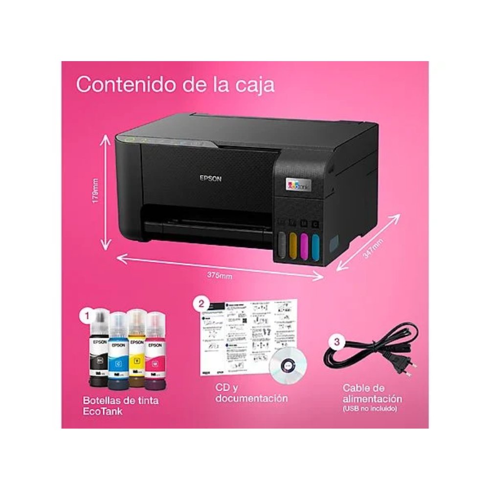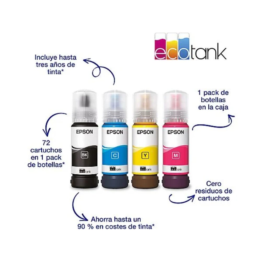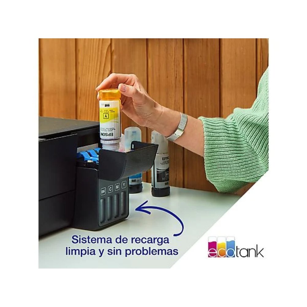 Epson EcoTank ET-2814 es un equipo multifunción de inyección de tinta con funciones de impresión, copia y escaneado. Utiliza un sistema de depósitos de tinta recargables y funcionamiento sin cartuchos. Admite conexión Wi‑Fi, Wi‑Fi Direct y USB para la comunicación con ordenadores y dispositivos compatibles. Trabaja con papel hasta formato A4 e incorpora una bandeja de entrada de hasta 100 hojas y una bandeja de salida de hasta 30 hojas. La resolución máxima de impresión es de 5760 x 1440 dpi. El escáner de cama plana integra sensor CIS con resolución óptica de 1200 x 2400 dpi. El panel de control está integrado en el cuerpo del equipo y permite ejecutar operaciones de copia y configuración. El dispositivo admite carga frontal de tinta mediante botellas compatibles de la serie EcoTank y es compatible con impresión desde aplicaciones y servicios de la plataforma Epson Connect.