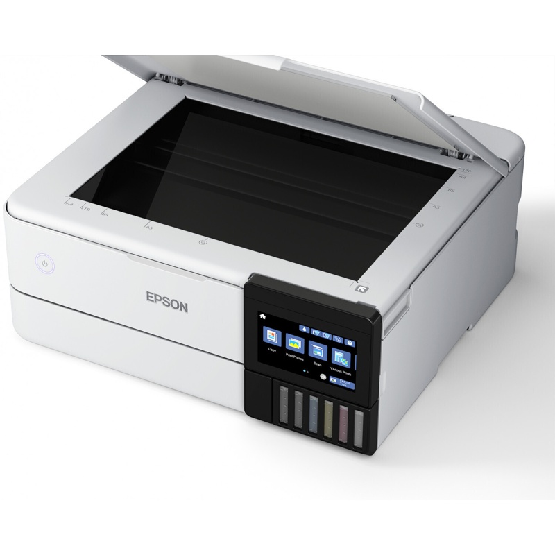 La Epson EcoTank ET-8500 es una impresora fotográfica multifunción de inyección de tinta con funciones de impresión, copia y escaneo. Utiliza un sistema de depósitos de tinta recargables EcoTank con 6 tintas Epson Claria ET Premium. Admite papel hasta formato A4 y impresión de fotos sin bordes. Incorpora conectividad Wi‑Fi, Wi‑Fi Direct, USB y Ethernet, además de ranura para tarjetas SD y puerto USB para impresión desde soportes de almacenamiento. Dispone de pantalla táctil de 10,9 cm para el control de funciones y acceso a ajustes del equipo. Incluye bandeja frontal para papel, bandeja para papel fotográfico y escáner de superficie plana. La velocidad de impresión indicada es de hasta 12 ppm. Es compatible con Apple AirPrint, Epson iPrint y la aplicación Epson Smart Panel.