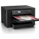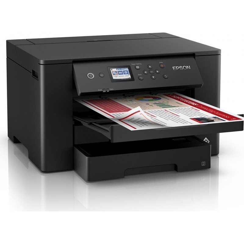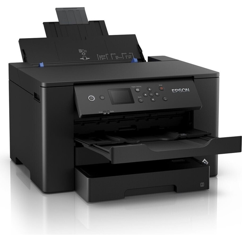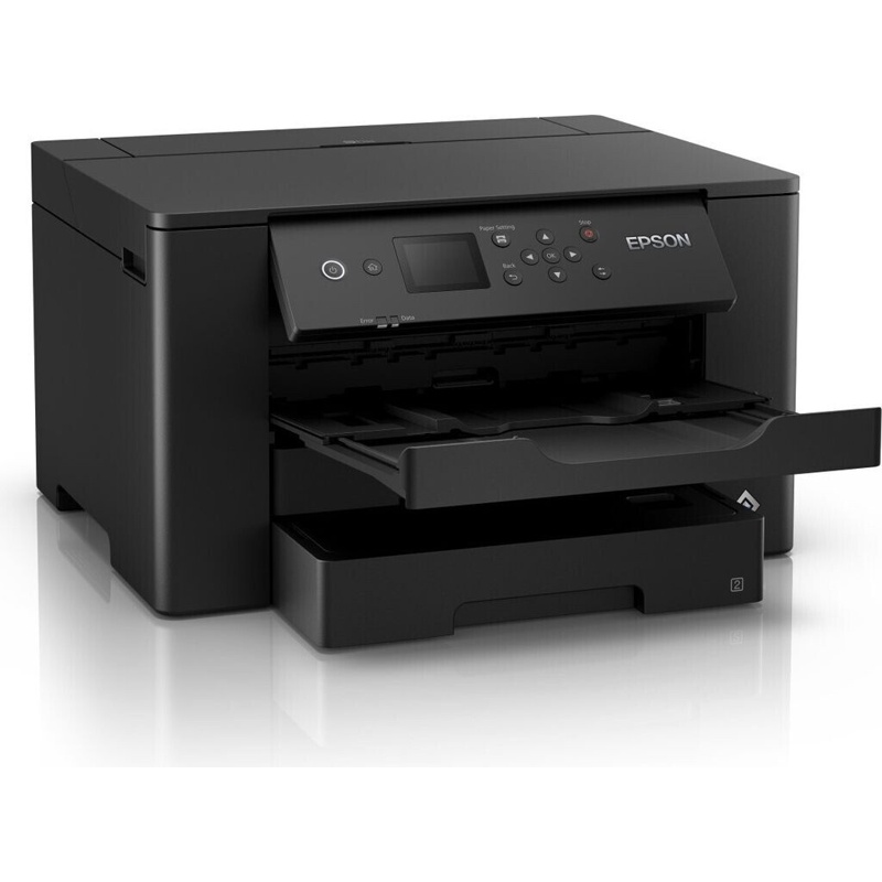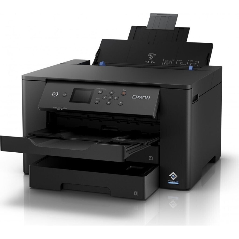 Impresora de inyección de tinta Epson WorkForce WF-7310DTW con impresión en formato A3+ y dúplex automático. Utiliza cabezal de impresión PrecisionCore y sistema de cartuchos de tinta independientes de 4 unidades. Velocidad de impresión ISO/IEC 24734 de 25 páginas por minuto en impresión monocromática y 12 páginas por minuto en impresión a color. Resolución máxima de impresión de 4800 x 2400 dpi. Incorpora dos bandejas frontales con capacidad de 250 hojas cada una y alimentación trasera de 50 hojas, con capacidad total de papel de 550 hojas. Admite soportes en formatos A3+, A3, A4, A5, A6, B5, Letter, Legal, sobres y papel fotográfico. Integra conexión USB, Ethernet, Wi‑Fi y Wi‑Fi Direct. Es compatible con Apple AirPrint, Mopria y Epson Connect para envío de trabajos de impresión desde dispositivos compatibles. Incluye pantalla LCD de 6,1 cm para menús y estado del equipo.