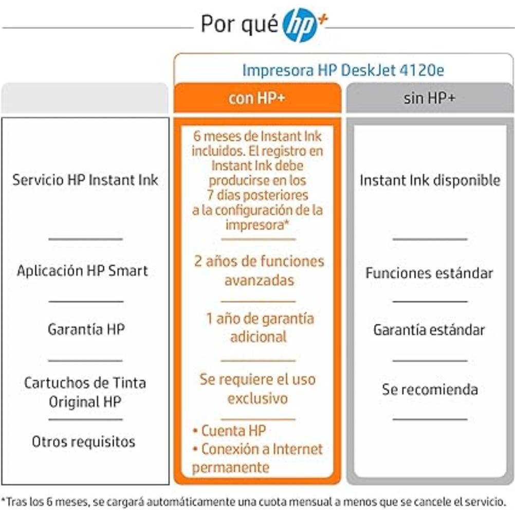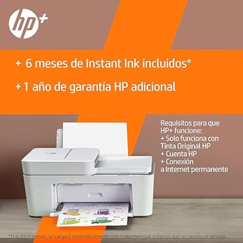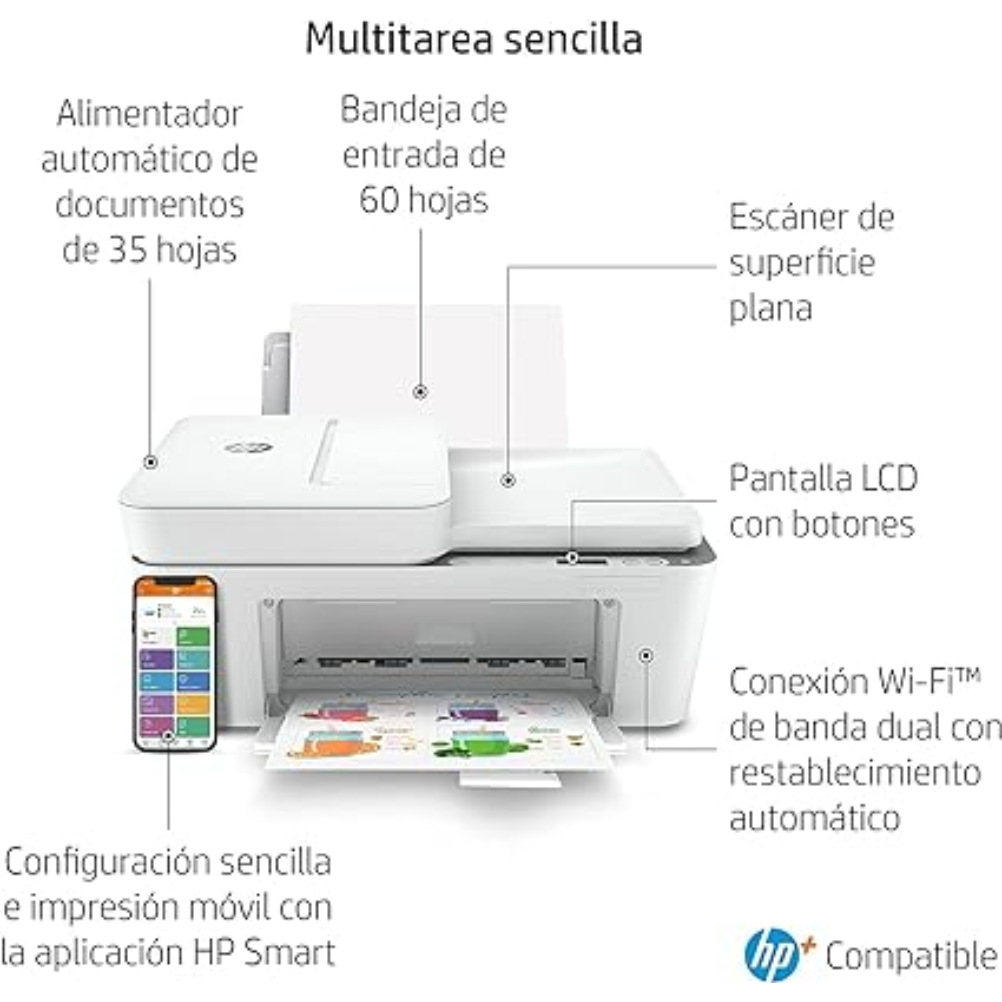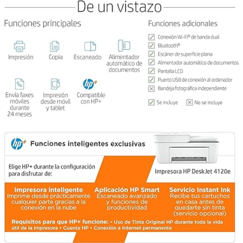 HP DeskJet 4120e A4 es una impresora multifunción de inyección térmica de tinta con funciones de impresión, copia y escaneo. Admite impresión en formato A4 y otros formatos de papel compatibles del equipo. Integra escáner de cama plana con sensor CIS y alimentador automático de documentos de 35 hojas. La bandeja de entrada tiene capacidad para 60 hojas y la bandeja de salida para 25 hojas. La velocidad de impresión ISO es de hasta 8,5 páginas por minuto en negro y hasta 5,5 páginas por minuto en color. La resolución de impresión es de hasta 1200 x 1200 ppp renderizados en negro y hasta 4800 x 1200 ppp optimizados en color; la resolución de escaneo es de hasta 1200 ppp. Dispone de conexión Wi‑Fi y puerto USB 2.0. Es compatible con impresión móvil mediante la aplicación HP Smart y Apple AirPrint. Utiliza cartuchos HP 305 y HP 305XL. El panel de control incorpora pantalla LCD con iconos.