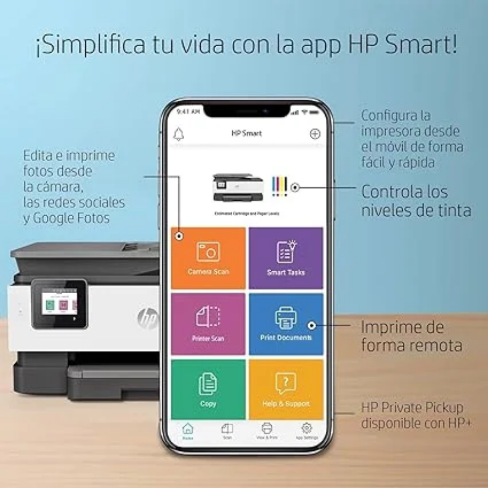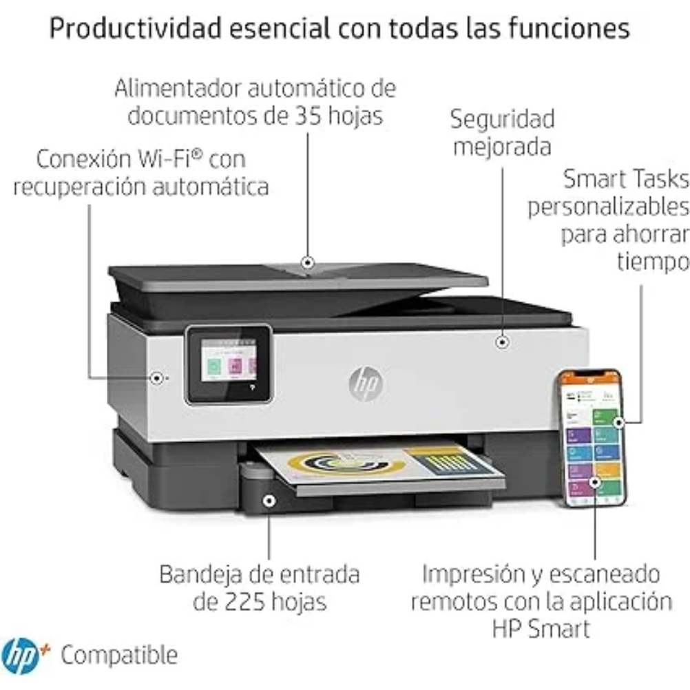 La HP OfficeJet Pro 8022e es una impresora multifunción de inyección térmica de tinta con funciones de impresión, copia, escaneo y fax. Integra conexión Wi‑Fi y puerto USB 2.0 para la conexión con equipos compatibles. Dispone de impresión automática a doble cara, alimentador automático de documentos de 35 hojas y escáner de superficie plana. La bandeja de entrada tiene capacidad para 225 hojas y la bandeja de salida para 60 hojas. Admite formatos A4, A5, A6, B5, sobres y otros soportes compatibles con sus especificaciones de papel. La velocidad de impresión ISO alcanza hasta 20 páginas por minuto en negro y hasta 10 páginas por minuto en color. La resolución de impresión llega hasta 4800 x 1200 ppp optimizados en color. Incorpora una pantalla táctil de 2,7 pulgadas para el control de las funciones del equipo. Es compatible con Apple AirPrint, Mopria y la aplicación HP Smart. Utiliza cartuchos HP 912 y HP 912XL.